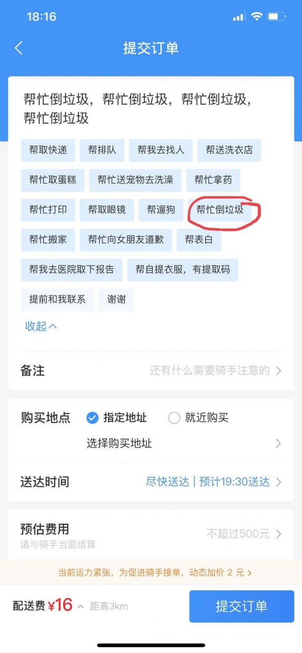 7月1日,《上海市生活垃圾管理条例》将正式施行。根据《条例》,对未将生活垃圾分类投放的个人可处以50至200元的罚款。或因此契机,近日饿了么上线了“代扔垃圾服务”,在App首页的“跑腿”中可以使用,一单12块,跑腿范围不超过3公里。