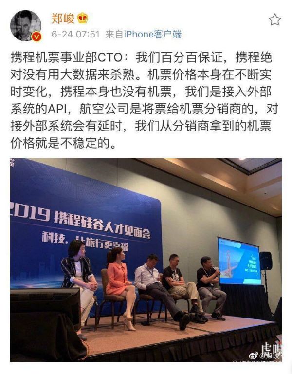 据科技记者 @郑峻 称,在今日的携程硅谷人才见面会上,现场有人再次提到了“大数据杀熟”的问题。对此携程机票事业部CTO回应道,我们百分百保证,携程绝对没有用大数据来杀熟。机票价格本身在不断实时变化,携程本身也没有机票,我们是接入外部系统的API,航空公司是将票给机票分销商的,对接外部系统会有延时,我们从分销商拿到的机票价格就是不稳定的。