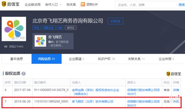 启信宝显示,北京奇飞翔艺商务咨询有限公司6月20日新增股权出质信息,它将奇虎三六零软件(北京)有限公司的14500股权出质给招商银行股份有限公司深圳分行,状态显示为无效。