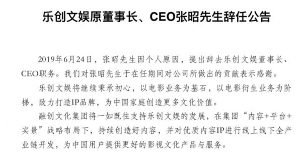 6月24日,乐视影业(现更名为“乐创文娱”)官方公众号发布了乐创文娱原董事长、CEO张昭辞职的官方公告,乐创文娱方面向第一财经确认了张昭离职的消息。对于张昭离职的原因,公告称是个人原因。