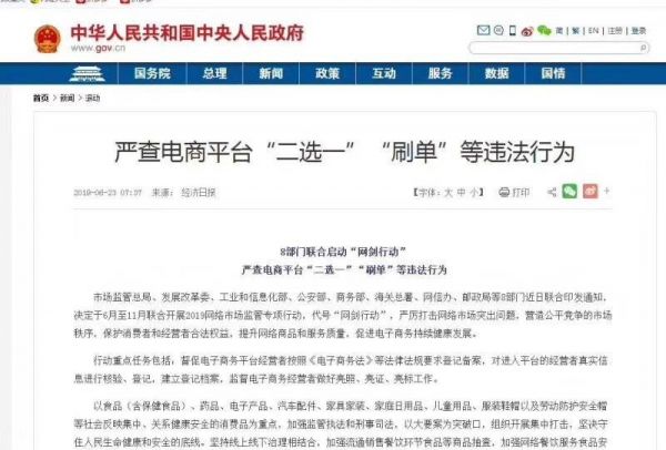 1. 市场监管总局、发展改革委、工业和信息化部、公安部、商务部、海关总署、网信办、邮政局等8部门近日联合印发通知,决定于6月至11月联合开展2019网络市场监管专项行动,代号“网剑行动”,严厉打击网络市场突出问题,营造公平竞争的市场秩序,保护消费者和经营者合法权益,提升网络商品和服务质量,促进电子商务持续健康发展。