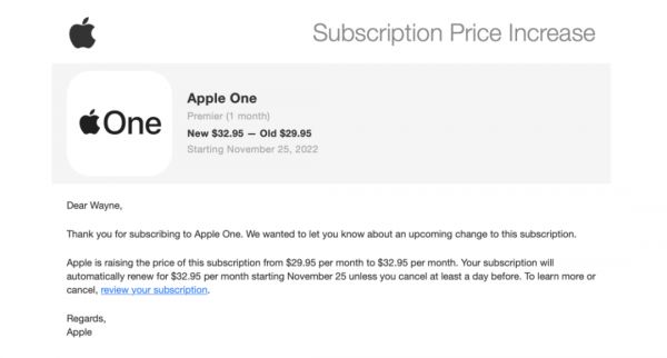以近期宣布上调订阅价格的 Apple One 订阅服务为例。Apple 在美国当地时间 10 月 24 日宣布 Apple One 高级订阅方案的价格由原来的 29.95 美元上调至 32.95 美元,根据 App Store 订阅通知的相关规定,Apple 也在第一时间向我发送了邮件通知。而由于 Apple One 的订阅价格调整没有超过 5 美元、且涨幅小于 50% ((32.95-29.95)/32.95≈9%),因此 Apple 只向我发送了这一价格变化的相关通知,并没有询问我是否需要允许价格上调就继续为我保留和订阅了该项服务。