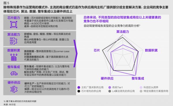 模式众多,都是主机厂和自动驾驶三方供应商基于自身能力和行业判断做出的现实选择。自动驾驶领域的关键竞争要素主要体现在芯片能力、算法能力、数据积累、整车集成、硬件供应五大方面,不同类型的参与者,在五大方面的禀赋优势也有所差异。