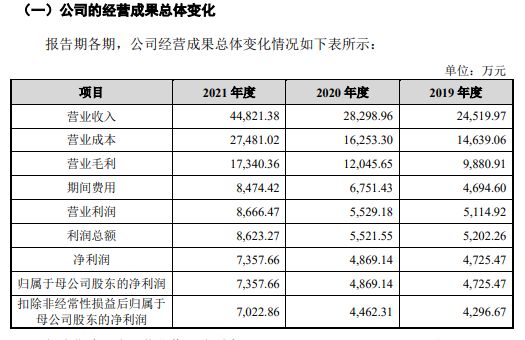 此次上市,泓博医药财务数据一直表现不错,报告期内2019-2021年,公司营业收入分别为2.45亿元、2.83亿元、4.48亿元;营业利润占营业收入的比例分别为20.86%、19.54%和19.34%,期间费用率分别为19.15%、23.86%和 18.91%,公司净利润分别为4725.47万元、4869万元、7357.66万元。
