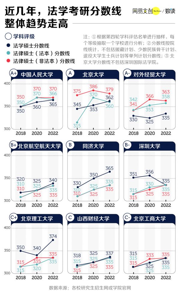 2022 年,考研人数达到了 457 万人,竞争加剧,法学也不例外。从 2018 年到 2022 年,在我们的统计样本中,法学学科评级从 A+ 到 C- 的学校,法学考研分数线都在走高。