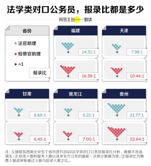 从平均报录比看,法学专业最对口的法官助理、检察官助理的数据并不算吓人,例如法官助理一职在部分省份的平均报录比依然低于 10:1。