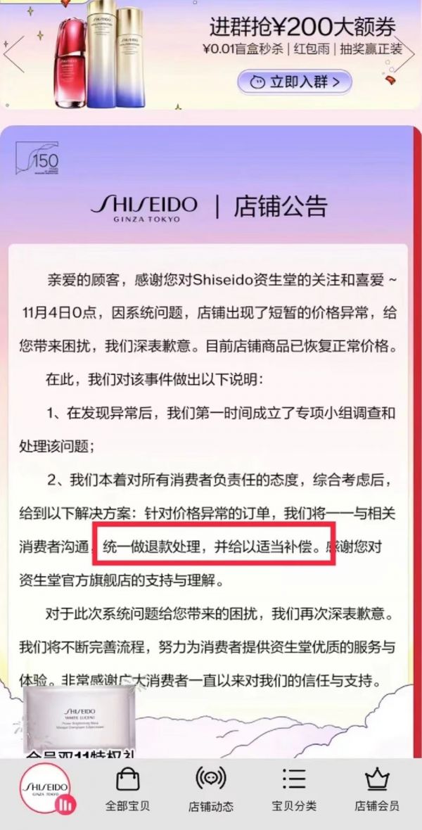 对此,资生堂官方旗舰店发公告回应,888为系统问题所致的异常价,针对价格异常的订单,将一一与相关消费者沟通,统一做退款处理。