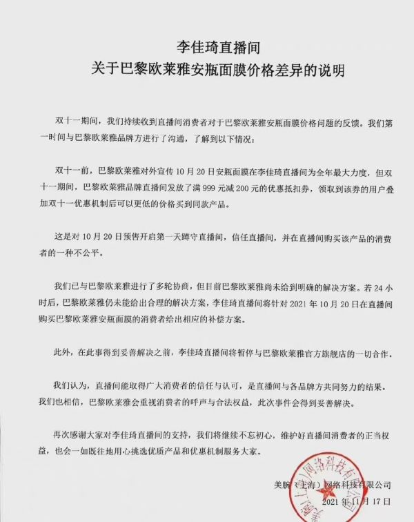 去年11月,欧莱雅找到李佳琦销售安瓶面膜,并在双十一前宣传在李佳琦直播间可以以“全网最低价”购买。然其后该店铺发放大量满999减200元的优惠券,导致领券后买的消费者可以更低的价格拿到。