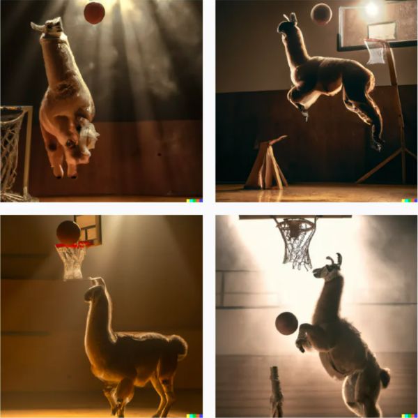 用户可以通过简短的文本描述(prompt)来生成相应的图像,使得不会画画的人也可以将自己的想象力变为艺术创作,例如“羊驼打篮球”这句话生成的四张图片,看起来就非常符合大家预期的想象。