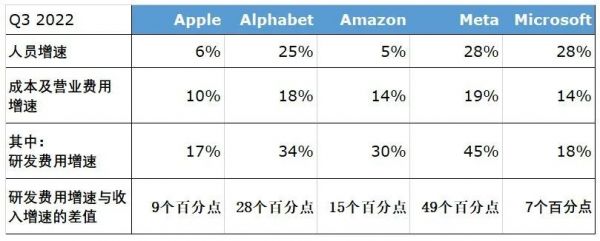结果就是:所有美国科技巨头的成本费用增速都超过了收入增速,研发费用增速又远远超过了整体成本费用的增速。在这方面,Meta最夸张,研发费用增速比收入增速快了49个百分点;谷歌快了28个百分点;亚马逊快了15个百分点。在这种情况下,它们的营业利润和净利润当然不会太好看。