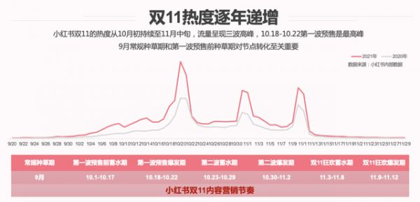 大促期间,品牌最先要做的就是先看清和把握时机。由于现在的双11从预售到结束已接近一个月时间之久,而各电商平台的时间安排又略有不同,小红书和微博就都根据电商平台的节奏,给出了平台内的广告流量库存变动预测,以此为品牌商家提前做广告计划提供建议。