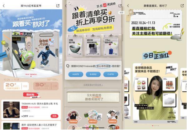 今年10月,小红书发布时尚主播成长计划,并宣布要针对双11期间的直播进行扶持,丰富行业货品供给,增加公域流量,为中腰部主播提供成长工具。与此同时,在10月24日晚8点,站内的“双11小红书买买节”也正式开启,活动少套路,不做预售,而是直接设置了跨店满300-50的优惠。
