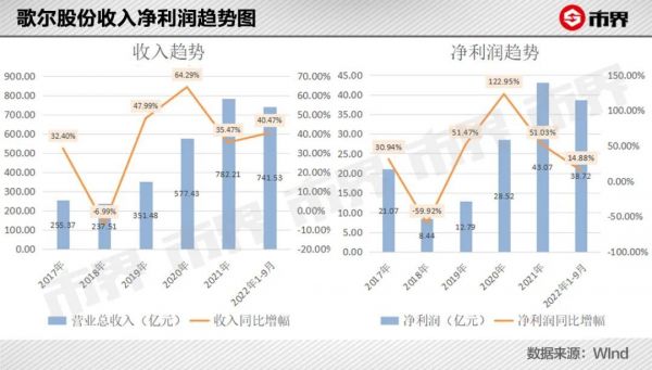 从2017年到2021年,歌尔股份总收入从255.37亿元增至782.21亿元,净利润从21.07亿元增至43.07亿元,2022年前三季度其收入和净利润同比均有增长,分别为741.53亿元和38.72亿元,同比增幅分别达到40.47%和14.88%。