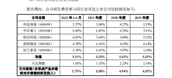 除此之外,天元智能的研发实力也稍逊于同行。从数据上看,报告期内,公司研发费用分别为 1521.51万元、1682.38万元、1703.67万元和989.54万元,占营业收入的比例分别为2.16%、2.25%、1.53%和1.95%,占比整体呈现下降趋势。而今年上半年,行业研发费用率均值为5.11%,但天元智能只有1.95%。