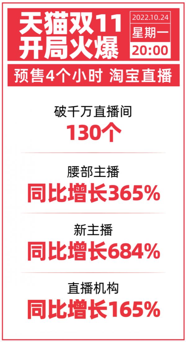 官方数据显示,10月24日开卖首小时,淘宝直播场观同比增速600%,腰部主播交易额同比增速250%;以罗永浩、遥望梦想站、蜜蜂惊喜社、香菇来了为代表的新主播,烈儿宝贝、陈洁kiki、Timor小小疯等核心腰部主播异军崛起,预售开播不到1小时,场观均超1000万人次;开卖4小时,天猫双11预售淘宝直播即产生了130个预售金额破千万的直播间,同时直播机构销售额也取得了165%的同比增长。