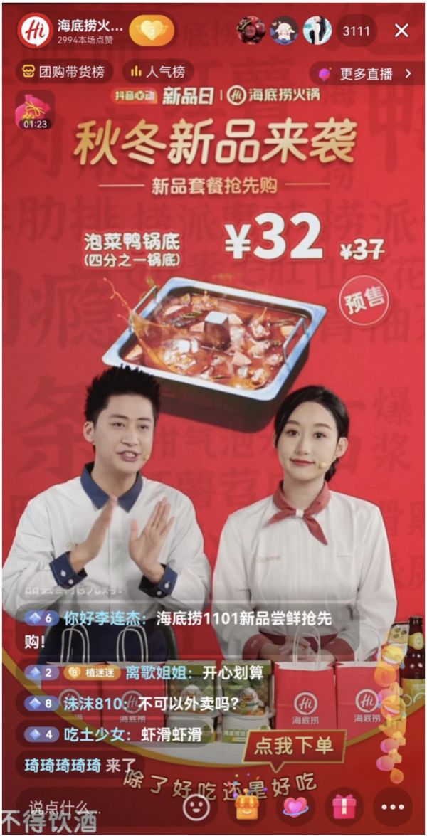 以海底捞为例,在朝着餐饮零售化发展后,与电商场景的联动越来越多。除了在天猫、京东开店参与双11大促,今年海底捞还借着新品发布的契机到抖音开启了直播。