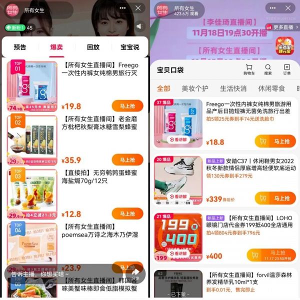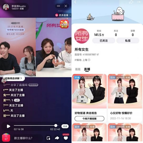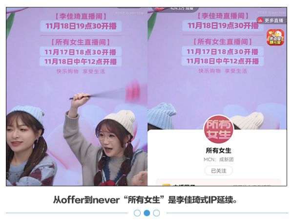 紧接着,是一个名为“所有女生”的新直播间的宣传预告——和“李佳琦”直播间不同,这个刚刚开播6天的直播间,李佳琦不再出现,而是由他的副播:旺旺、庆子挑起了大梁。