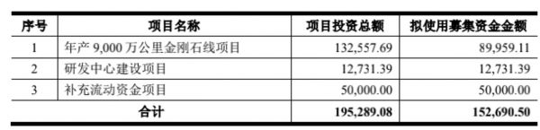 此番上市,聚成科技拟募资15.27亿元,其中9亿元用于投建年产9000万公里金刚线项目,该项目建设周期2年。