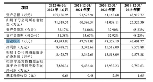 招股书显示,2019-2021年及2022年1-6月,聚成科技实现营收4.34亿元、4.74亿元、4.78亿元和4.38亿元;归属净利润为9583.88万元、1.55亿元、3342.69万元、8478.73万元;扣非净利润为9750.63万元、1.39亿元、9436.44万元、7830.34万元。