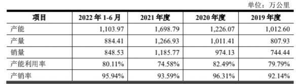 然而需要注意的是,聚成科技募资加码背后,现有产能并未完全饱和。据招股书,2019-2021年及2022年上半年,公司产能利用率为79.79%、82.49%、74.58%和80.11%。从报告期内的产能及销量数据看,公司产能、销量最高的2021年,金刚线产能1698.79万公里,产量1185.77万公里。相比公司计划新增产能9000万公里/年相距甚远。