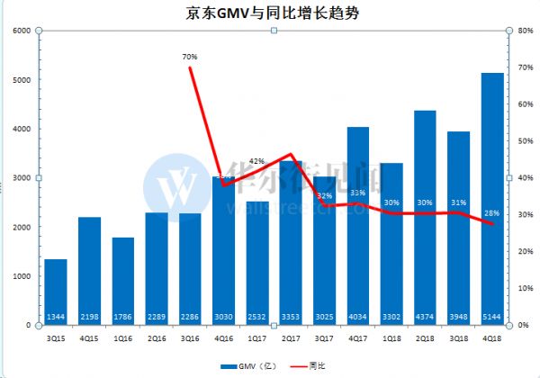 四季度GMV同比增速呈下滑趋势,低于30%。四季度京东GMV达到5144亿元,同比增长28%;不过环比转为上涨30%,上季度为环比下跌10%。