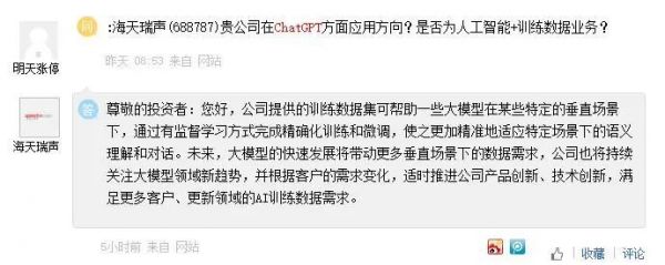 不过,海天瑞声的回复并没有提及ChatGPT,仅表示将持续关注大模型领域新趋势,并根据客户的需求变化,适时推进公司产品创新、技术创新,满足更多客户、更新领域的AI训练数据需求。