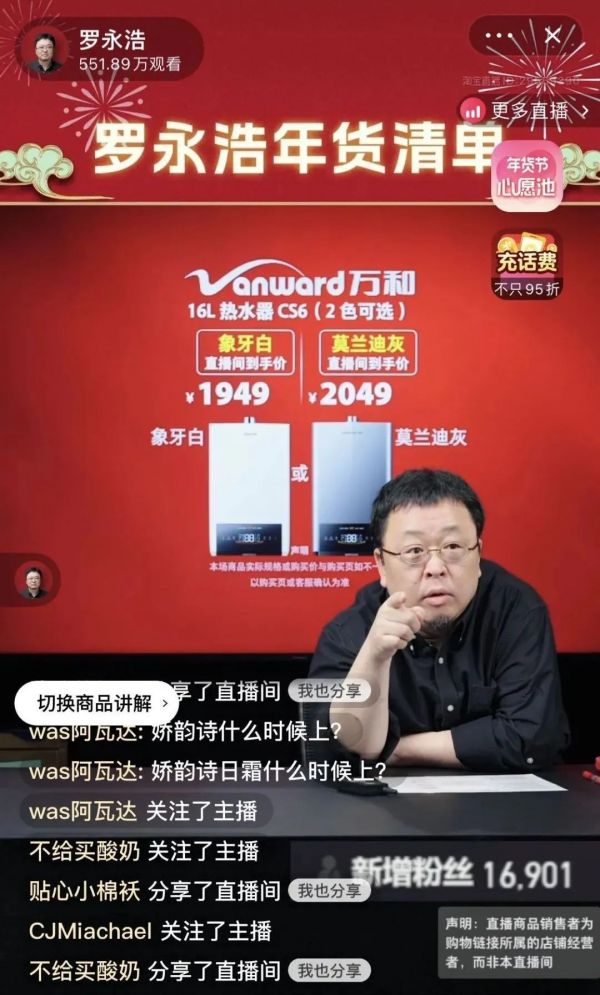 相安无事地又播了两个商品后,来到了本场直播最大的“雷区”万和热水器。该商品直播板的价格分别为1949元和2049元,而详情页显示券后价为1964元和2064元。罗永浩反复询问是到底哪个才是对的,现场无一人能直接给予准确回答。折腾来来回 回10分钟后,罗永浩彻底发飙。