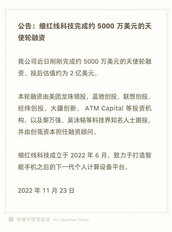 好在对于罗永浩来说,并不都是坏消息。11月底,罗永浩AR创业公司细红线科技宣布刚刚完成约5000万美元(约合3.57亿元)的天使轮融资,投后估值约为2亿美元(约合14.28亿元)。