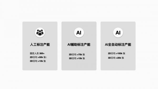 在产能维度, 以3D图片为例,其AI全自动标注的日均产能为>20K张,比AI辅助标注的日均产能高5K张,比人工标注的日均产能高10K张。