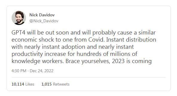 我保证会让人大吃一惊。我认识几个已经试过 GPT-4 的人,他们都对它印象深刻。GPT-4 确实很快就要来了(根据一些传言,这个时间可能是2023 年春天)。当它问世时,将会令 ChatGPT 黯然失色;可以肯定的是,会有更多人讨论它……