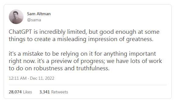 ChatGPT 存在极大的局限性,但在某些事情上做得很好,足以给人一种十分出色的假象。目前想靠它来做任何重要的事情是不靠谱的。这是进步的预览;在健壮性和可信性方面,我们还有很多工作要做。