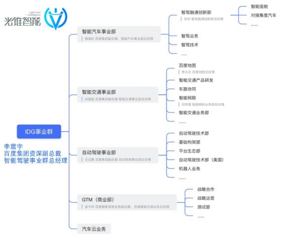 目前,IDG事业群除了支持部门之外,主要还有智能汽车事业部、智能交通事业部和自动驾驶事业部,分别负责百度自动驾驶在车、路、行方面的技术和商业化落地。