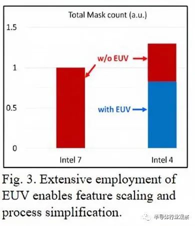 英特尔将在 Intel 4 工艺中将 EUV 引入制造,然后在 Intel 3 中深化该技术的使用。据英特尔称,在没有 EUV 的情况下,从Intel 7 到Intel 4,每个 CPU 需要使用的掩模数量将增加 30%。相反,Intel 4 所需的掩膜数量下降了 20%。总流程步骤减少了 5%。