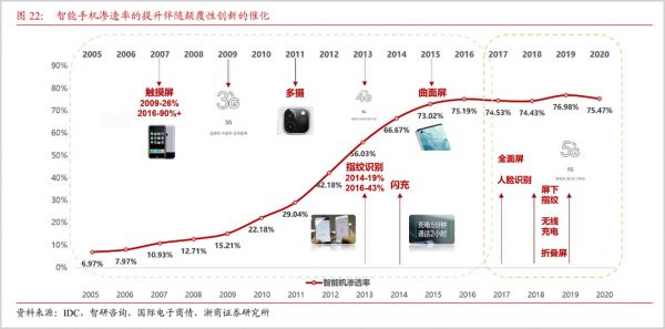 作为科技化产品,消费电子属于典型的“供给创造需求”的行业,以手机的发展为例,每次渗透率的大幅提升,都伴随着功能的颠覆性创新。