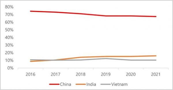 作为产量遥遥领先的全球第一大手机制造国,中国产量占全球份额由2016年的75%下降至2021年的67%。由于地缘政治和成本因素,印度和越南逐渐成为中国产能转移的重要方向。