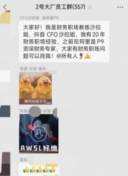 根据一位与“沙拉姐”同群的群友爆料,“沙拉姐”自称是阿里资深总监P9,抖音CFO,拥有20年的职场财务经验。而群主则介绍她是真正的大佬,在阿里直接向俞永福(阿里本地生活CEO)汇报。而“沙拉姐”则称也和昆阳(饿了么执行总裁)搭档过。