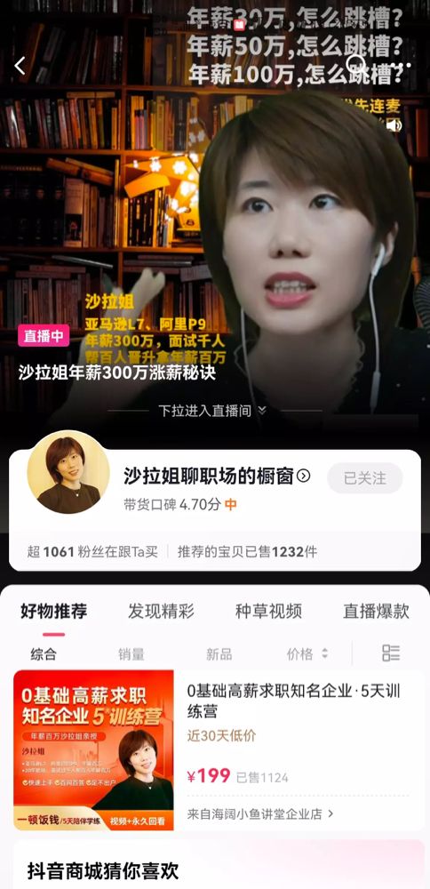 从抖音橱窗的销售量看,沙拉姐售价为199元的求职名企课,销量为1124份,计算可知抖音单渠道的卖课收入为22.3万元。相比抖音上那些粉丝千万的网红,已经卖出几千万、上亿元的私董课,大厂高P卖课战绩还不算突出。