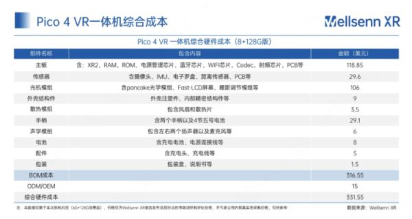 根据XR行业垂直研究机构维深信息对Pico4的成本拆解,“8+128G”款产品的硬件成本在331.55美元,约合人民币2373元,基本上与Pico4的定价2499相差无几,而这个成本费用还未算上研发、良品率、仓储运输,以及定制屏幕在内的价格。