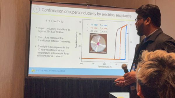 〓 迪亚斯正在会议现场介绍通过电阻来确定超导性