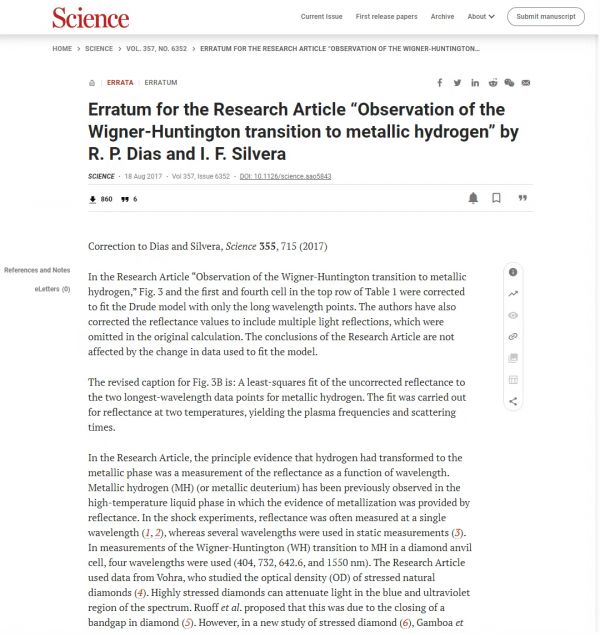 虽然近500 GPa的高压技术虽然很难,可国际上仍有几个研究组可以做到;但是根据迪亚斯的金属氢的制备,不仅同行们没有重复做出来,他自己也没复制出来。