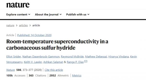 2020年10月14日,《自然》发表了迪亚斯团队撰写的题为《碳氢硫化物中室温超导电性》的论文。