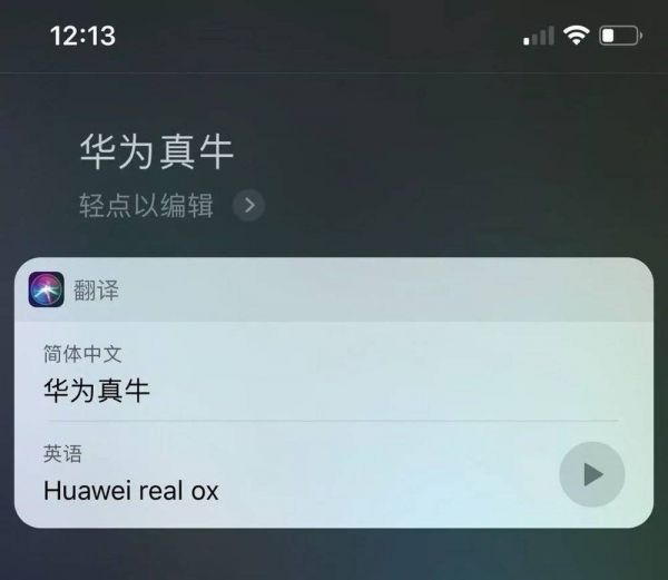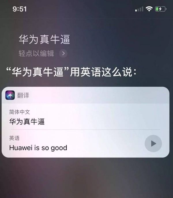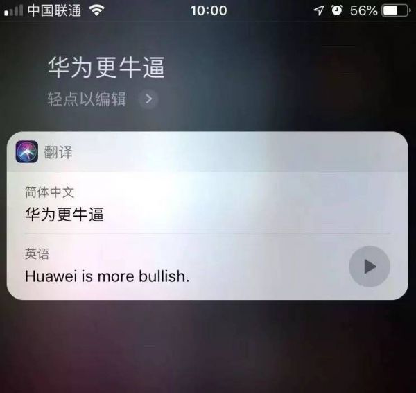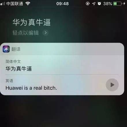 将翻译有问题的句子去掉中文中的“bi”,比如“华为真牛”,Siri通常会翻译成“XXX is a real cow”、“ is a real ox”。这也侧面论证了Siri翻译背后所采用的“看见不懂就直译”的路径存在。