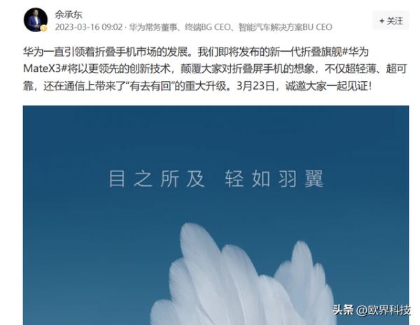 今日,华为常务董事余承东发文称,华为一直引领着折叠手机市场的发展,新一代折叠旗舰华为Mate X3将以更领先的创新技术,颠覆大家对折叠屏手机的想象。余承东表示,华为Mate X3不仅机身超轻薄、超可靠,还在通信上带来了“有去有回”的重大升级。