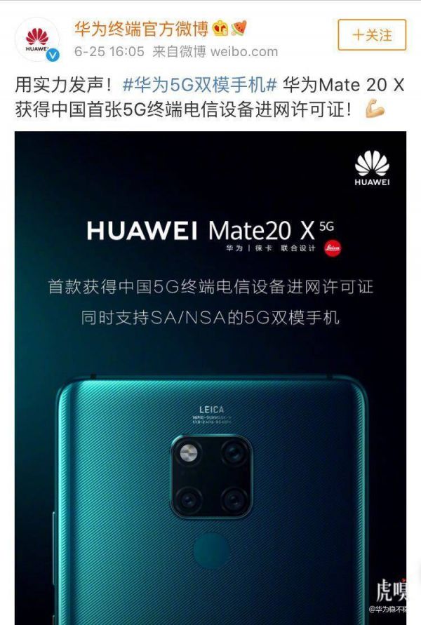 华为终端官方微博6月25日发布消息称,华为Mate 20 X获得中国首张5G终端电信设备进网许可证。