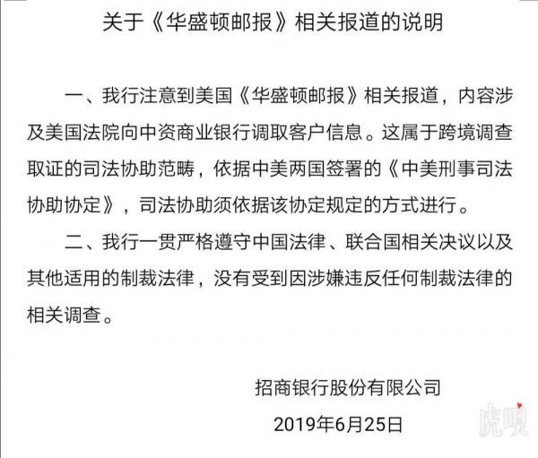 6月25日,就外媒报道一事,招商银行回应道,招行注意到美国《华盛顿邮报》相关报道,内容涉及美国法院向中资商业银行调取客户信息。这属于跨境调查取证的司法协助范畴,依据中美两国签署的《中美刑事司法协助协定》,司法协助须依据该协定规定的方式进行。招行一贯严格遵守中国法律、联合国相关决议以及其他适用的制裁法律,没有受到因涉嫌违反任何制裁法律的相关调查。