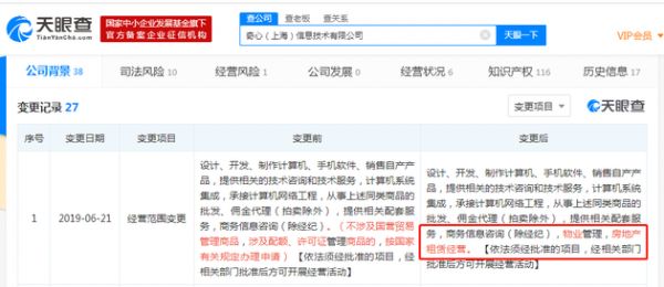 6月25日下午消息,天眼查数据显示,6月21日,奇心(上海)信息技术有限公司发生经营范围变更,新增“物业管理,房地产租赁经营”。奇心(上海)信息技术有限公司是快的系公司,后来被滴滴收购。