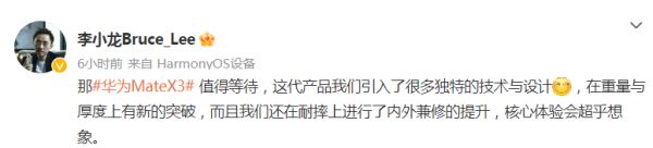 华为手机产品线副总裁李小龙今日也透露,华为Mate X3引入很多独特技术与设计,在重量和厚度上有新的突破,并且在耐摔上进行了内外兼修的提升,核心体验超乎想象。