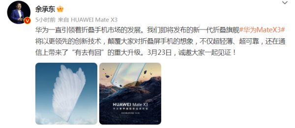 此外,华为常务董事余承东今日还发文称,华为一直引领着折叠手机市场的发展,新一代折叠旗舰华为Mate X3将以更领先的创新技术,颠覆大家对折叠屏手机的想象。余承东表示,华为Mate X3不仅机身超轻薄、超可靠,还在通信上带来了“有去有回”的重大升级。
