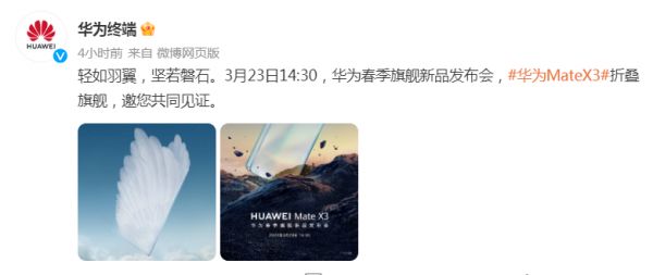 华为在宣布将于3月23日召开春季旗舰新品发布会后,今日,华为终端发布两张预热海报,透露了折叠屏新机华为Mate X3的两大黑科技亮点。