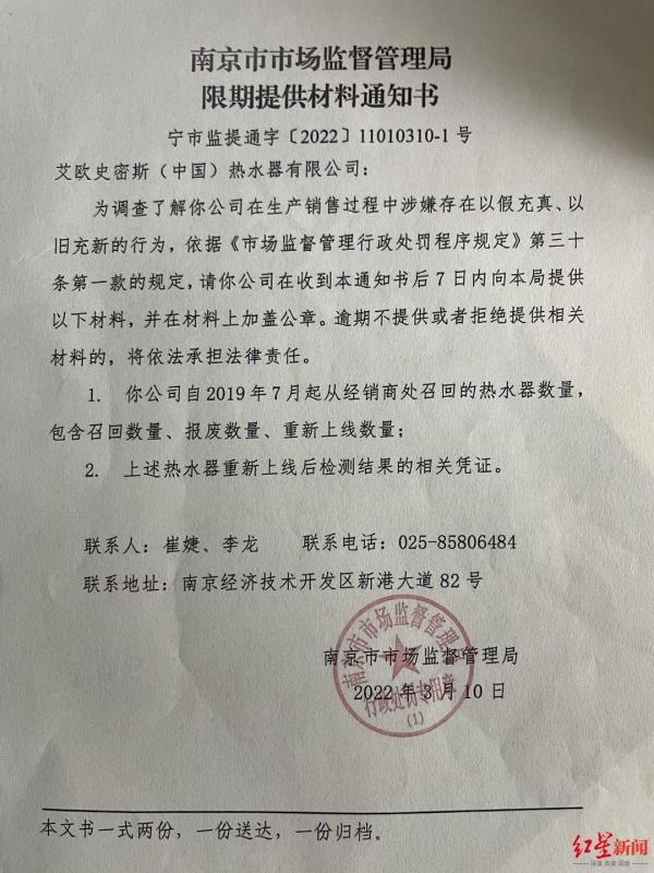↑南京市市场监督管理局通知史密斯限期提供材料